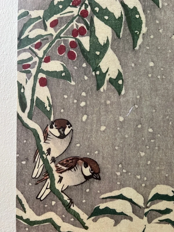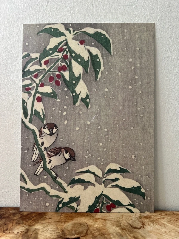 Mussen op een besneeuwde aalbessenstruik – Ohara Koson – 1 kunst kaart A4 (21×29,7cm)